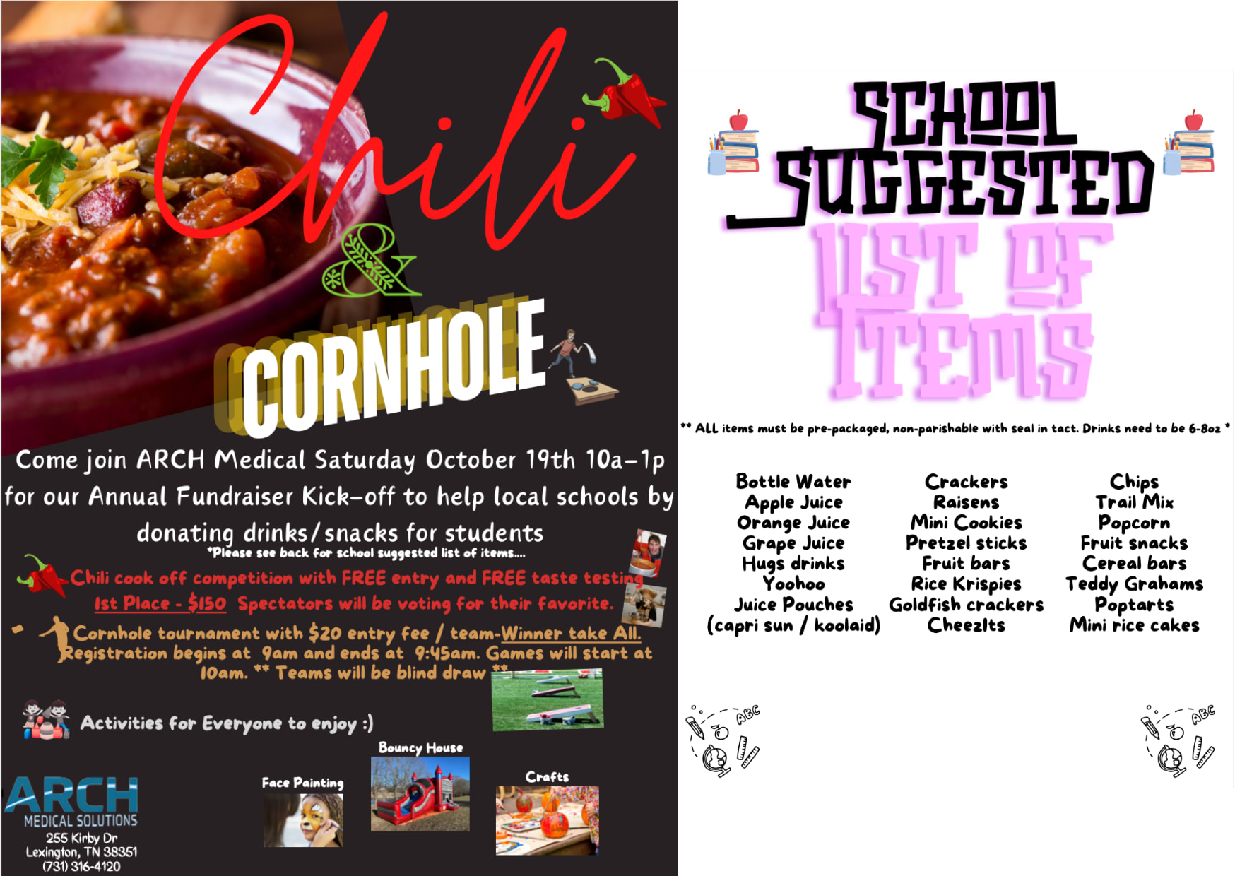 Come join Arch Medical on Saturday, October 19th, from 10 A.M. to 1 P.M. for our annual fundraiser kick-off. This fundraiser is in efforts to help local schools through the donation of drinks/snacks for students. Please see flyer for more information.