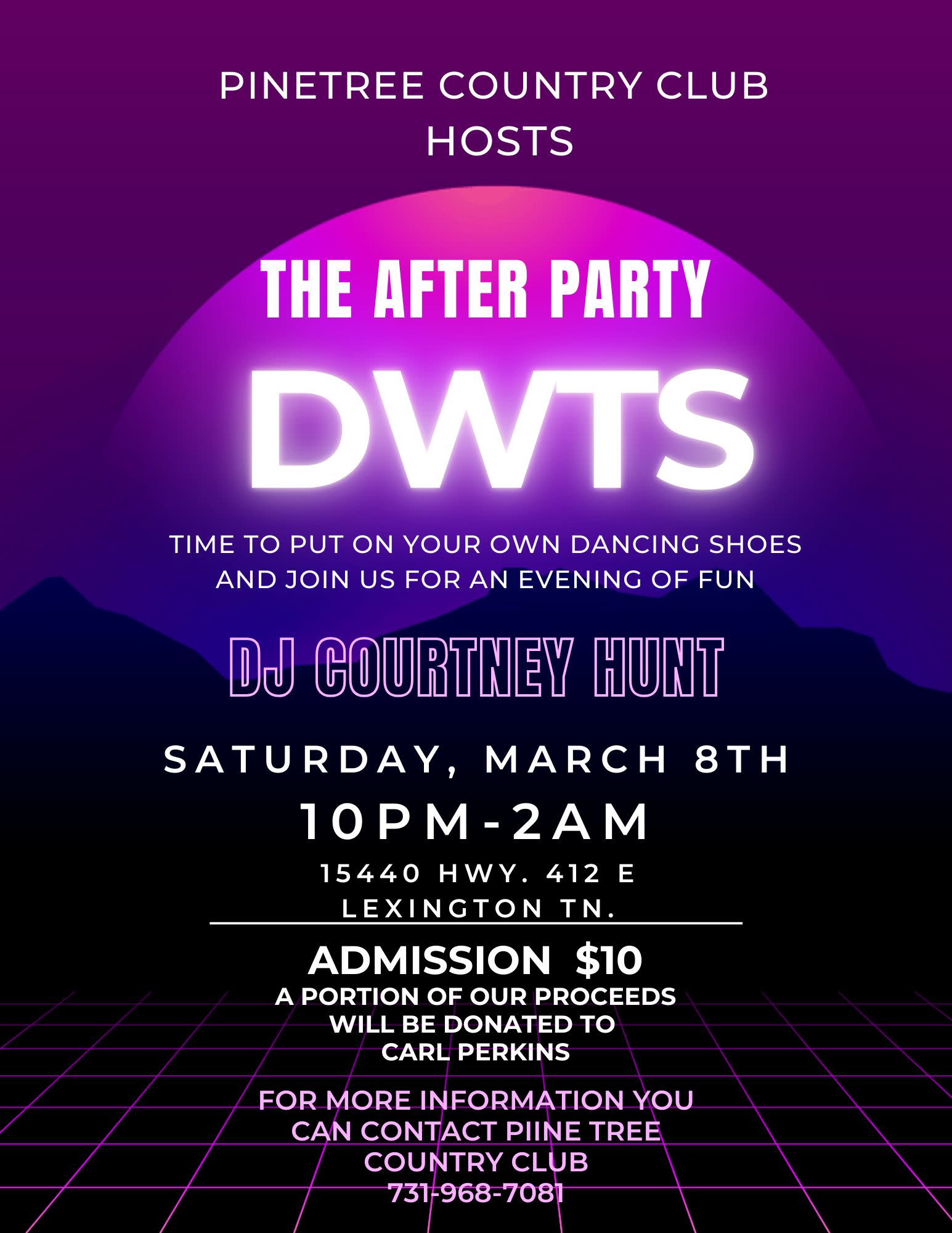 Time to put on your own dancing shoes and join Pine Tree Country Club for an evening of fun featuring DJ Courtney Hunt!! Details: Saturday, March, 8th, 10 P.M. - 2 A.M, located at 15440 Hwy. 412 E, Lexington, TN 38351. Admission is $10 and a portion will be donated back to the Carl Perkins Center. For more information, please contact Pine Tree at 731.968.7081