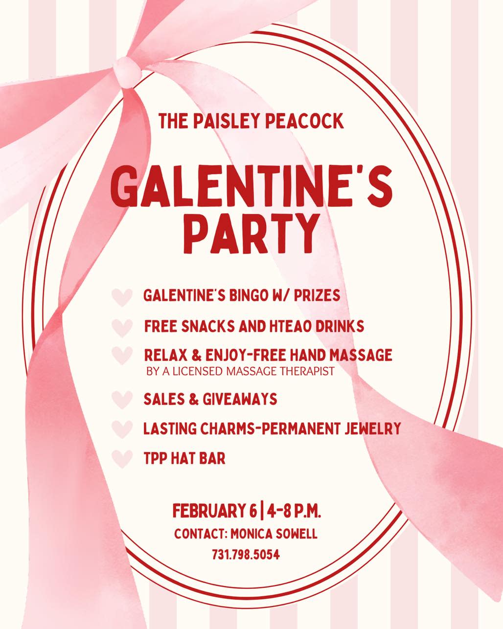 The Paisley Peacock is hosting a Galentine's Party on February 6th from 4-8 P.M. There will be Galentine's Bingo with prizes, FREE snacks and HTeaO drinks, FREE hand massages, sales/giveaways, Lasting Charms Permanent Jewelry, and a TPP's hat bar!! If you have any questions, please visit their location or call 731.798.5054