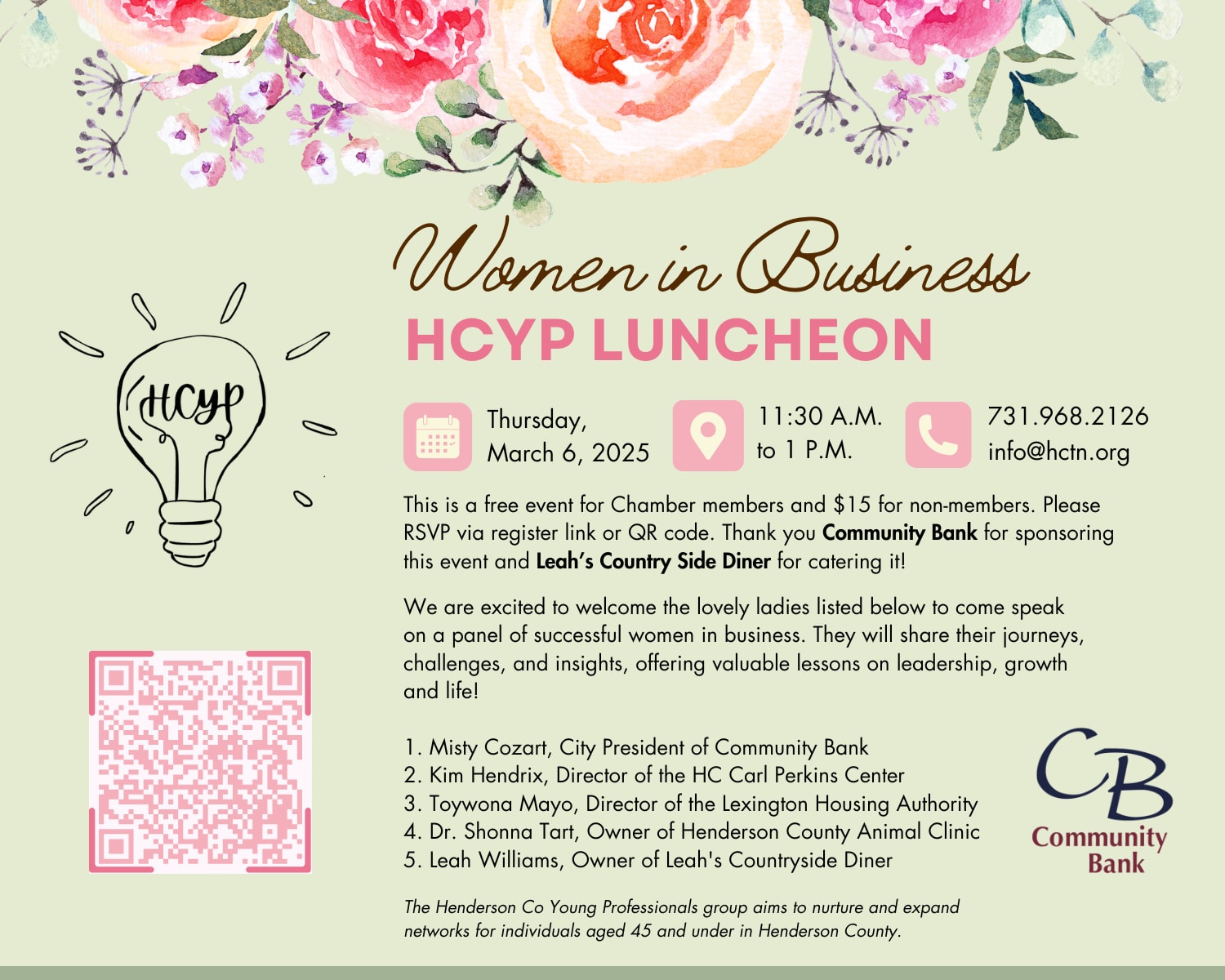 Please note: The Henderson Co Young Professionals group aims to nurture and expand networks for individuals aged 45 and under in Henderson County. Please RSVP here or scan the QR code in the flyer. If you have any questions, please contact the Chamber at 731.968.2126 or email info@hctn.org