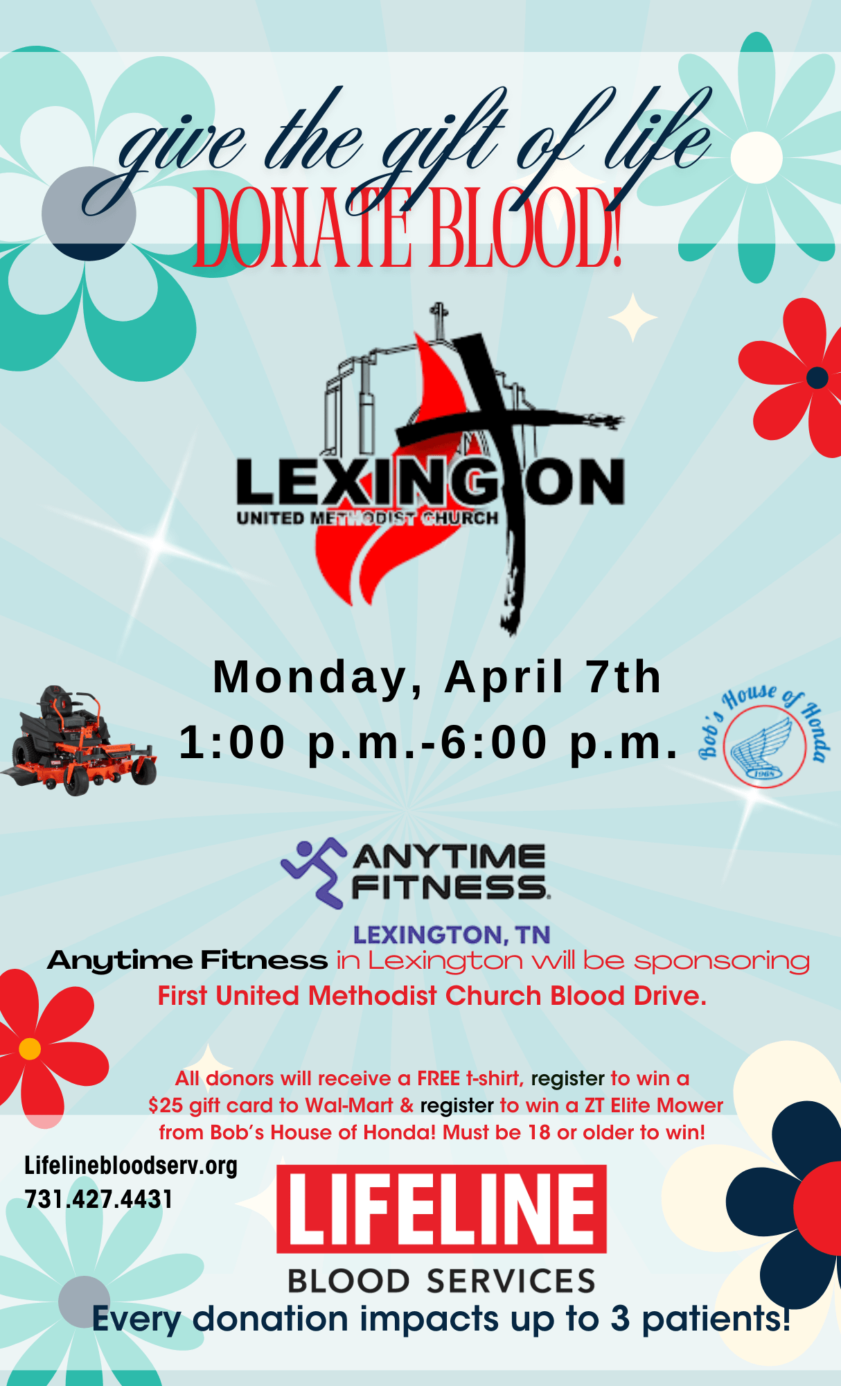 Lifeline Blood Services will be at First United Methodist Church on Monday, April 7th, from 1 P.M. - 6 P.M. Thank you to Anytime Fitness for sponsoring this blood drive. All doners will receive a free tshirt and an entry to win a ZT Elite Mower! Must be 18+ to win.